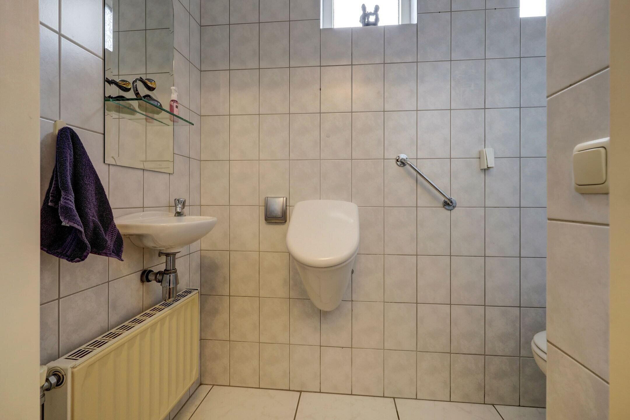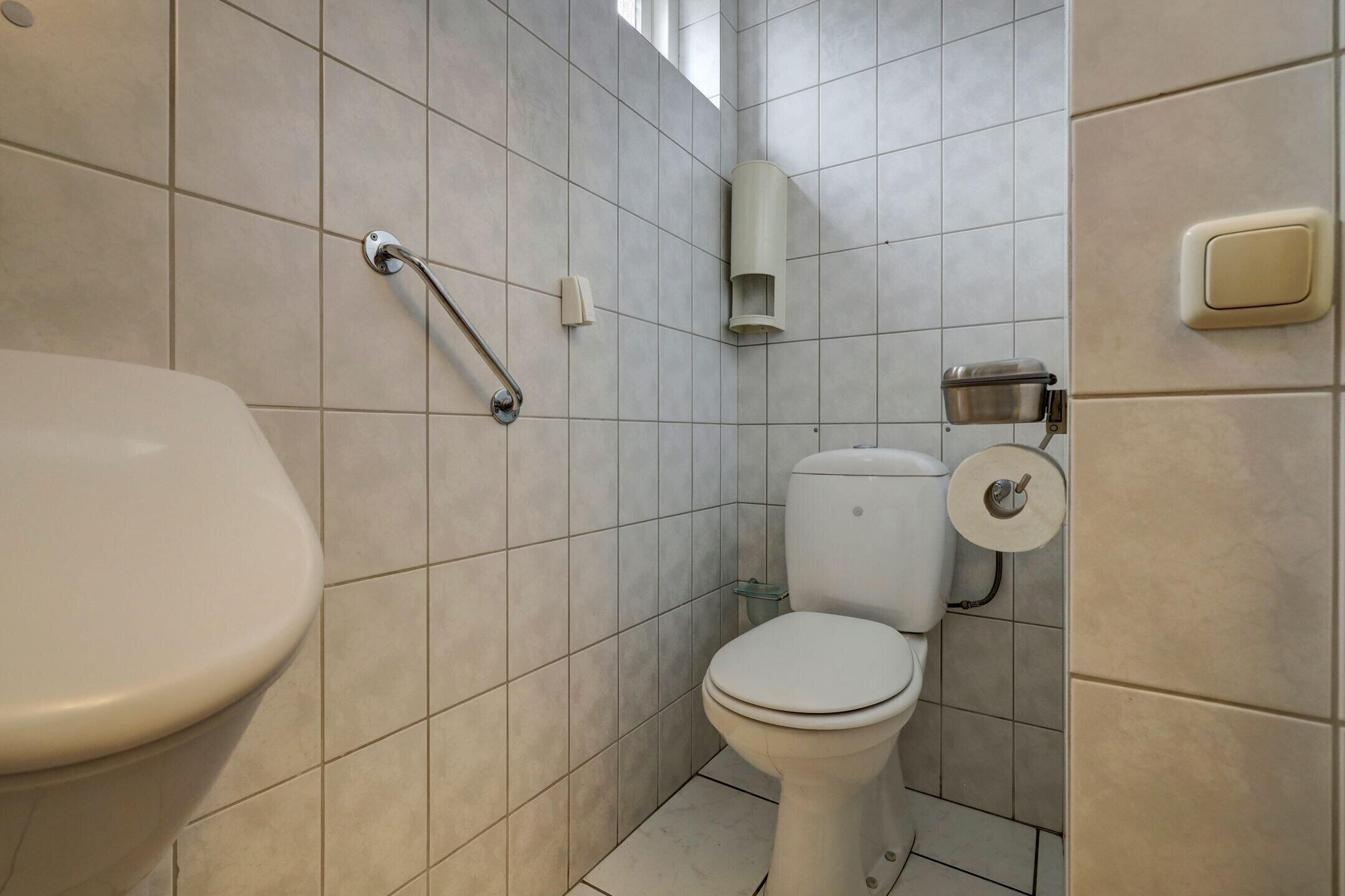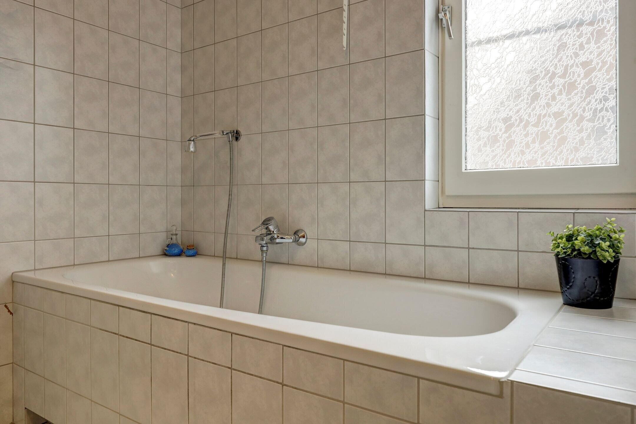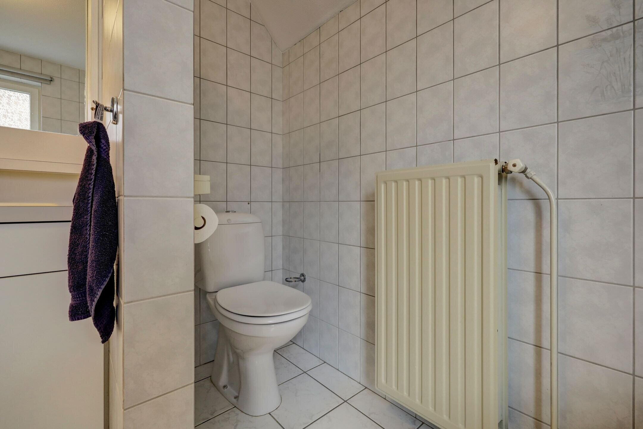 De badkamer is eveneens royaal opgezet en compleet ingericht. Je vindt hier een ligbad, een douchecabine met schuifdeur en een toilet dat netjes achter een wand is geplaatst voor extra privacy. Daarnaast zijn er twee wastafels aanwezig met daaronder een zeer ruim opbergmeubel. De grote spiegel boven het meubel beslaat de volledige wand en is voorzien van ingebouwde spotjes wat zorgt voor goede verlichting. Ook hier is gekozen voor een raam met figuurglas zodat je profiteert van daglicht en natuurlijke ventilatie zonder inkijk. De badkamer is uitgevoerd in neutrale, lichte tegels voor een tijdloze uitstraling.