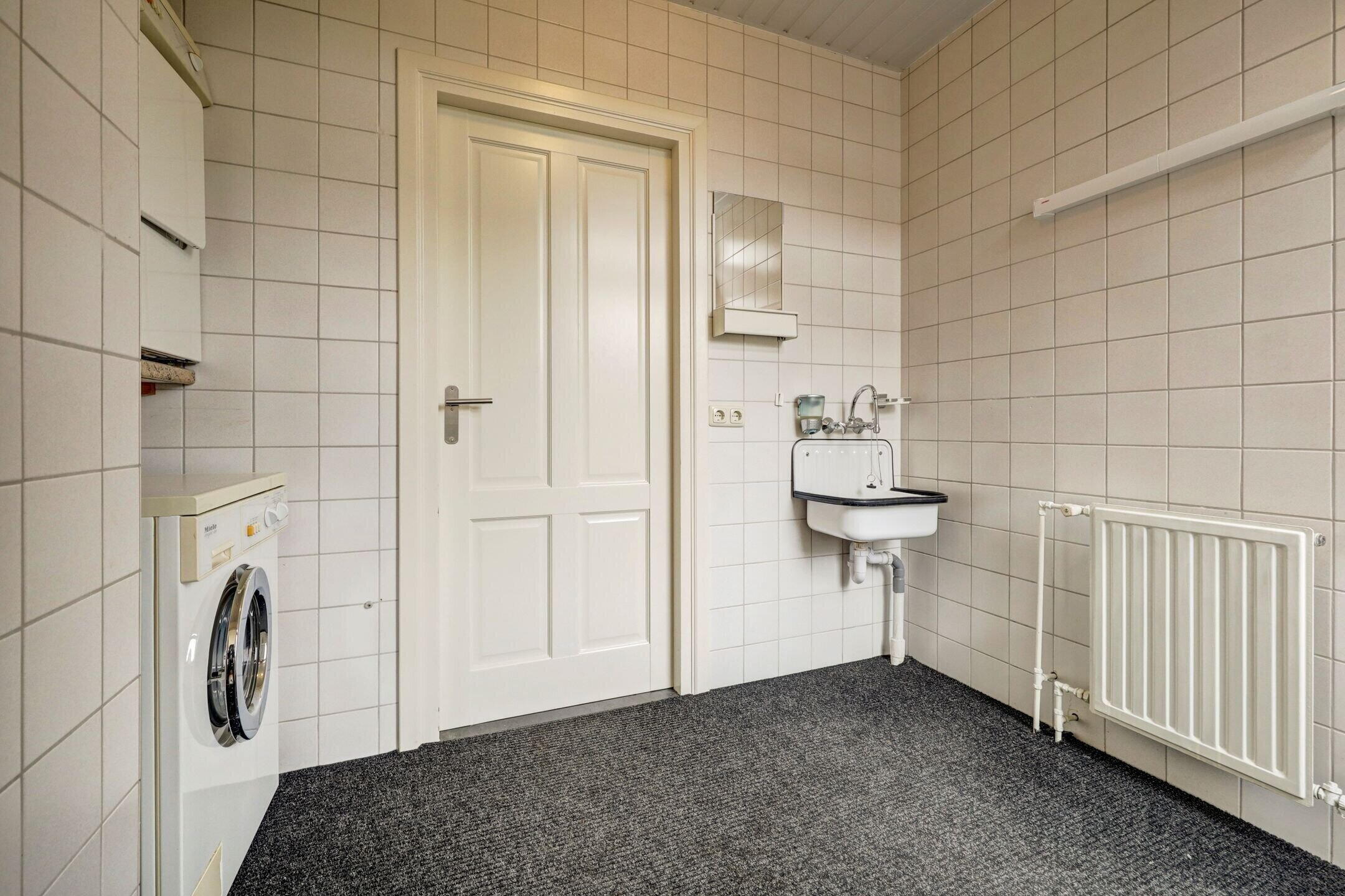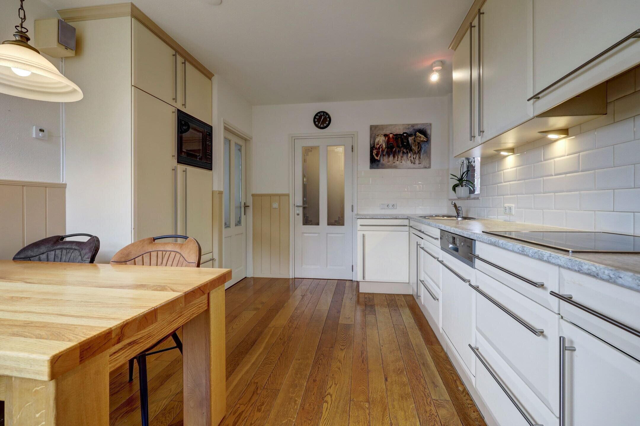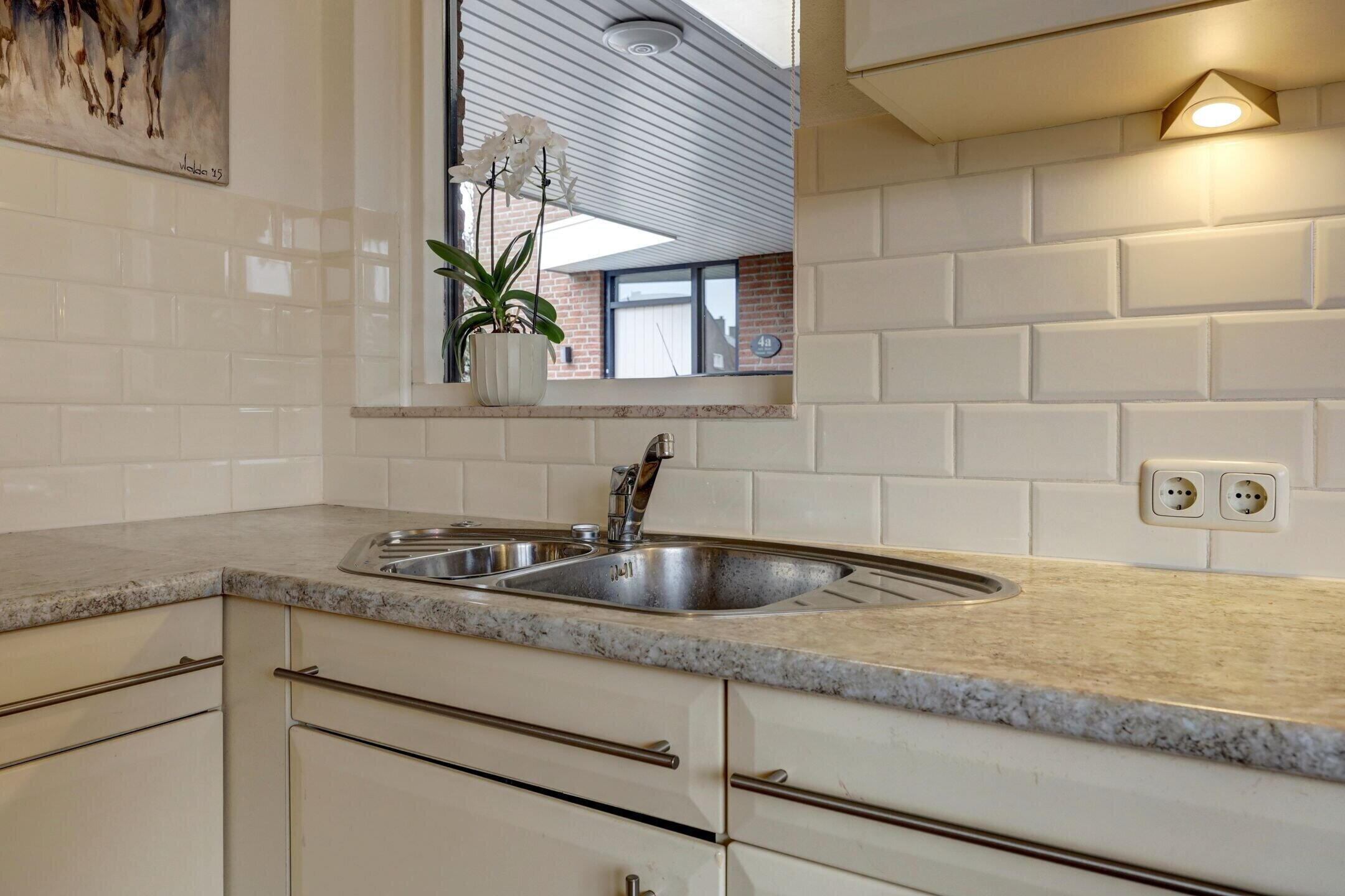 Vanuit de hal loop je door naar de keuken. Deze ziet er nog netjes en functioneel uit maar biedt ook volop mogelijkheden om naar eigen smaak te moderniseren. Je kookt hier op een vierpits keramisch fornuis of in de combi-oven. Verder zijn er een koelkast en een vaatwasser aanwezig waarbij de vaatwasser circa vijf jaar geleden nog is vervangen. De keuken beschikt over een anderhalve spoelbak, een onderhoudsvriendelijk kunststof aanrechtblad en een achterwand met witte metrotegels die zorgen voor een frisse uitstraling. Vanuit de keuken heb je zicht op de oprit en via het grote hoekraam geniet je van een mooi uitzicht over de achtertuin. Er is voldoende ruimte voor het plaatsen van een eettafel hoewel deze ook uitstekend in de woonkamer past. Hierdoor ontstaat de mogelijkheid om de keuken te vergroten en bijvoorbeeld te kiezen voor een royale opstelling met kookeiland. Achter de keuken bevindt zich nog een praktische bijkeuken/wasruimte. Hier vind je de witgoedaansluitingen, een wasbak met warm en koud water en een deur naar de tuin. Een fijne extra ruimte voor het dagelijkse gebruik.