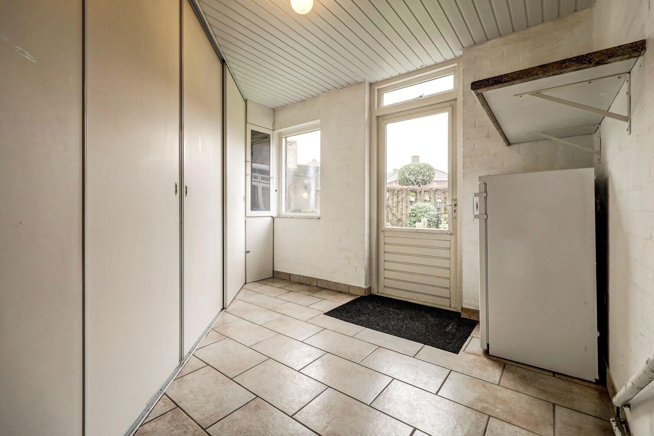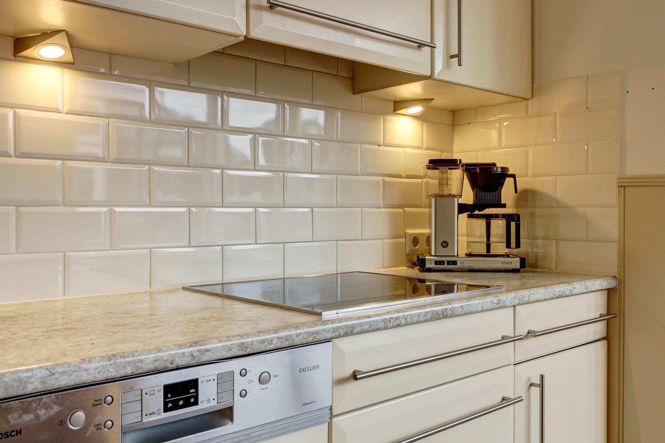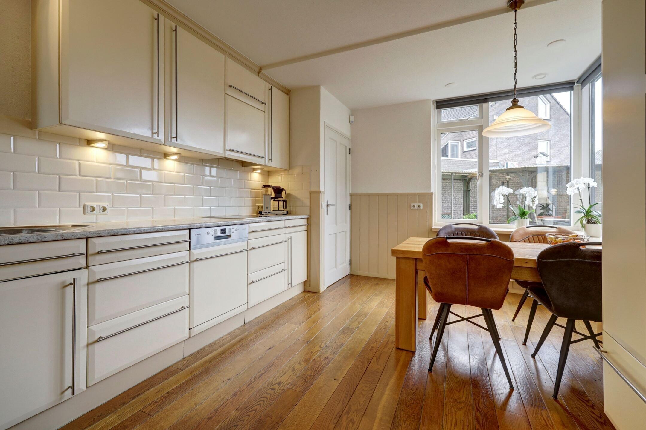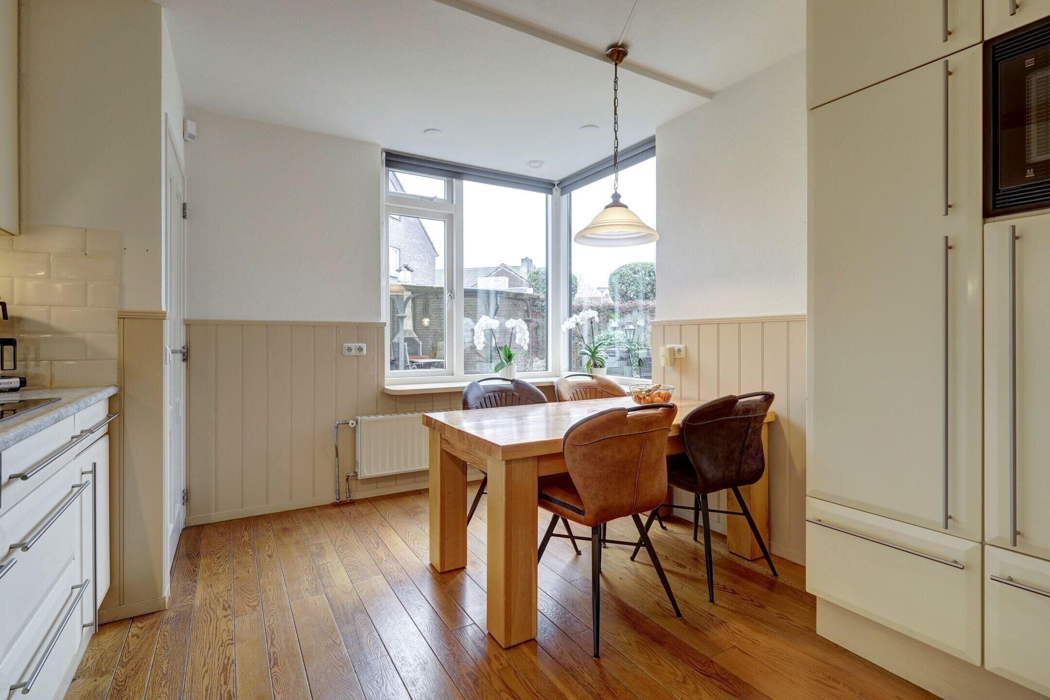 Vanuit de hal loop je door naar de keuken. Deze ziet er nog netjes en functioneel uit maar biedt ook volop mogelijkheden om naar eigen smaak te moderniseren. Je kookt hier op een vierpits keramisch fornuis of in de combi-oven. Verder zijn er een koelkast en een vaatwasser aanwezig waarbij de vaatwasser circa vijf jaar geleden nog is vervangen. De keuken beschikt over een anderhalve spoelbak, een onderhoudsvriendelijk kunststof aanrechtblad en een achterwand met witte metrotegels die zorgen voor een frisse uitstraling. Vanuit de keuken heb je zicht op de oprit en via het grote hoekraam geniet je van een mooi uitzicht over de achtertuin. Er is voldoende ruimte voor het plaatsen van een eettafel hoewel deze ook uitstekend in de woonkamer past. Hierdoor ontstaat de mogelijkheid om de keuken te vergroten en bijvoorbeeld te kiezen voor een royale opstelling met kookeiland. Achter de keuken bevindt zich nog een praktische bijkeuken/wasruimte. Hier vind je de witgoedaansluitingen, een wasbak met warm en koud water en een deur naar de tuin. Een fijne extra ruimte voor het dagelijkse gebruik.