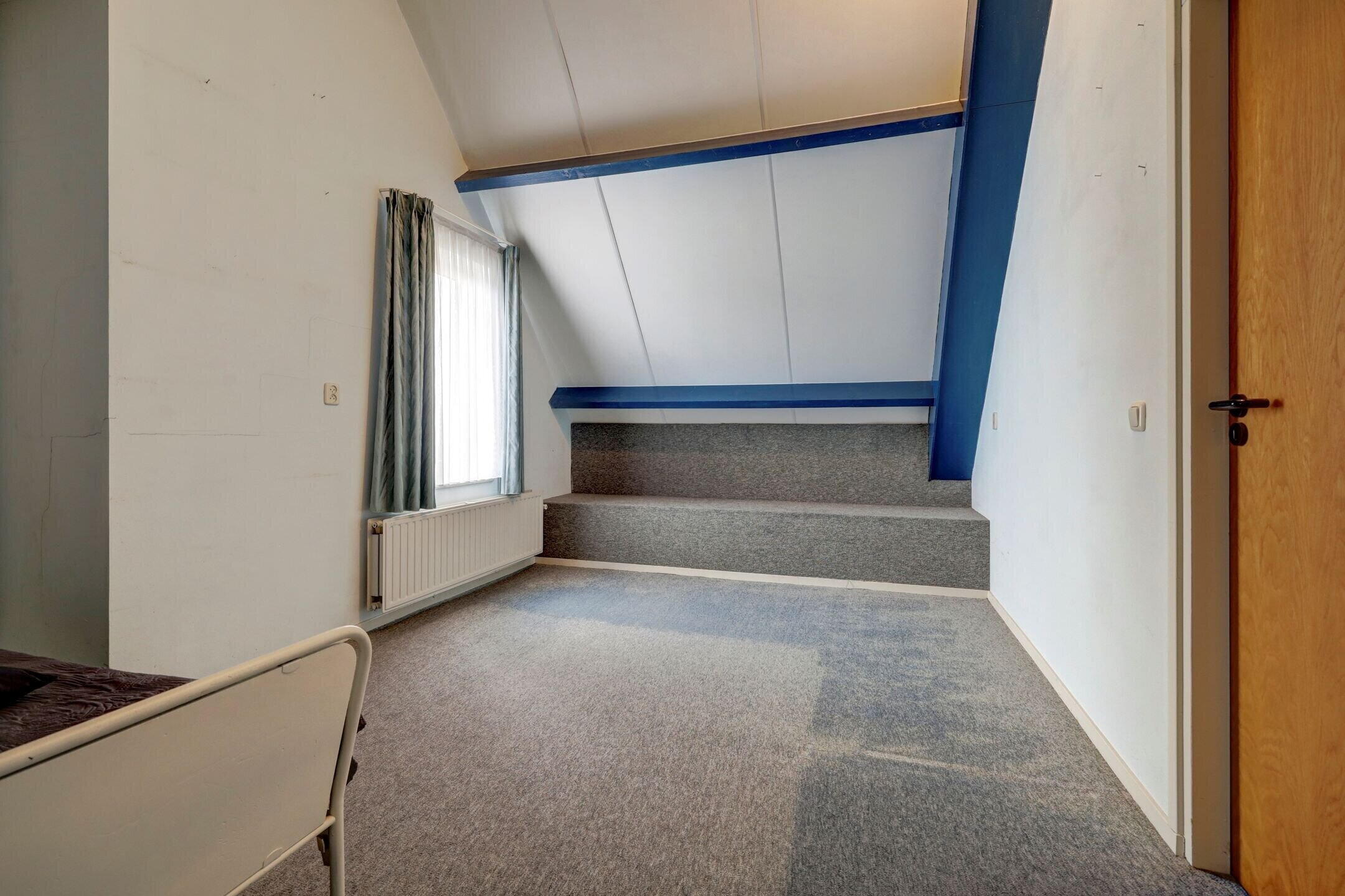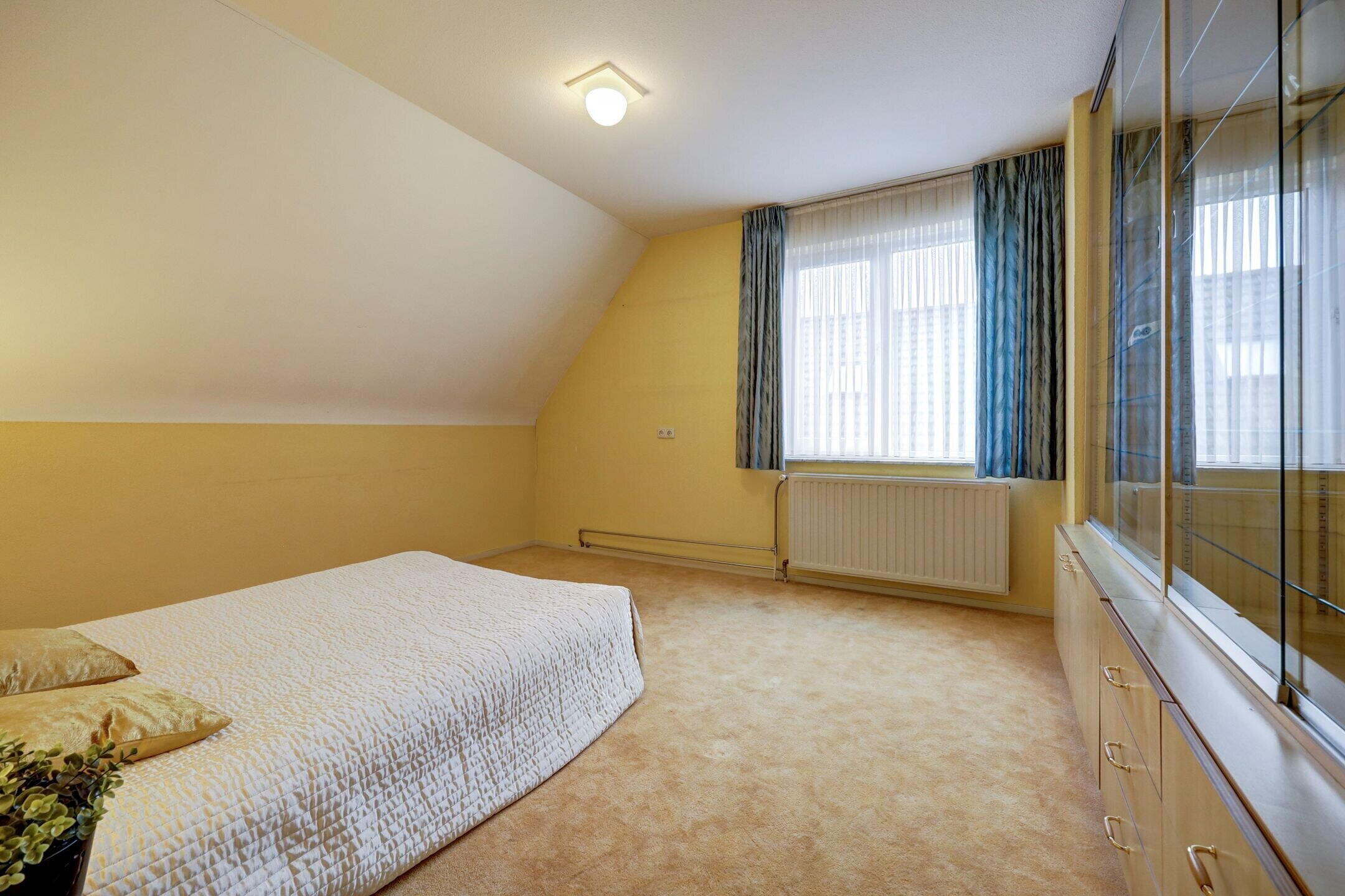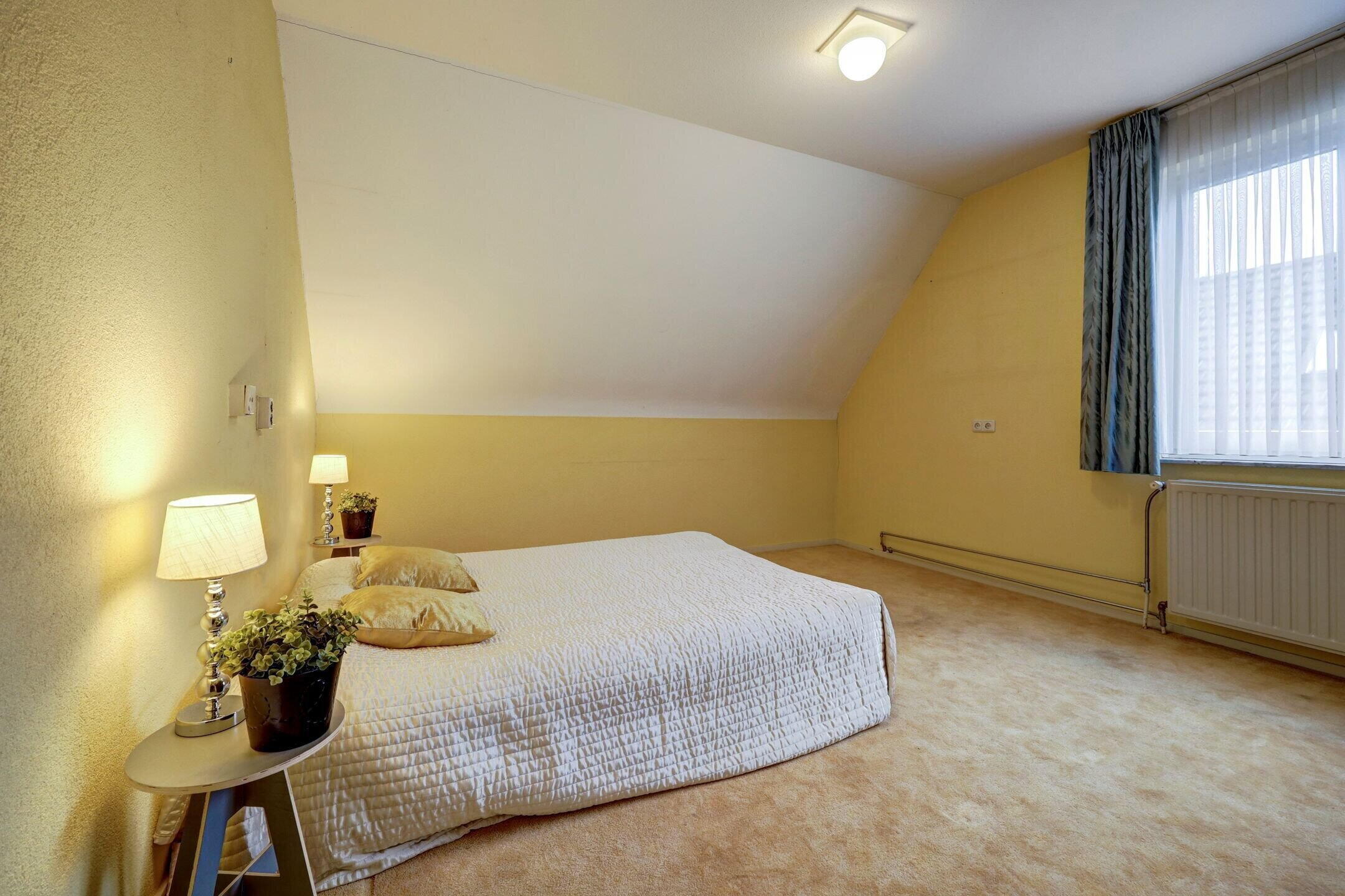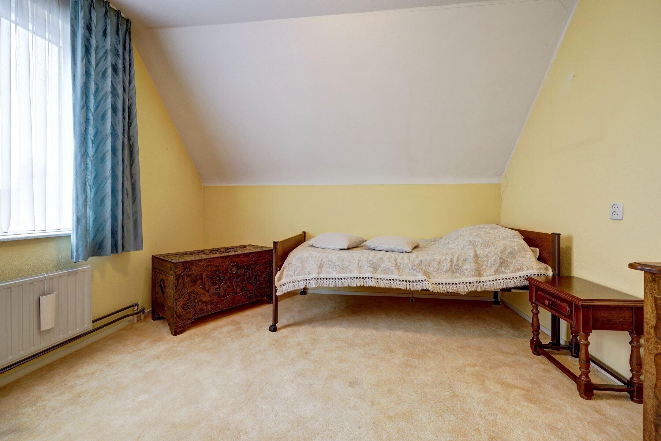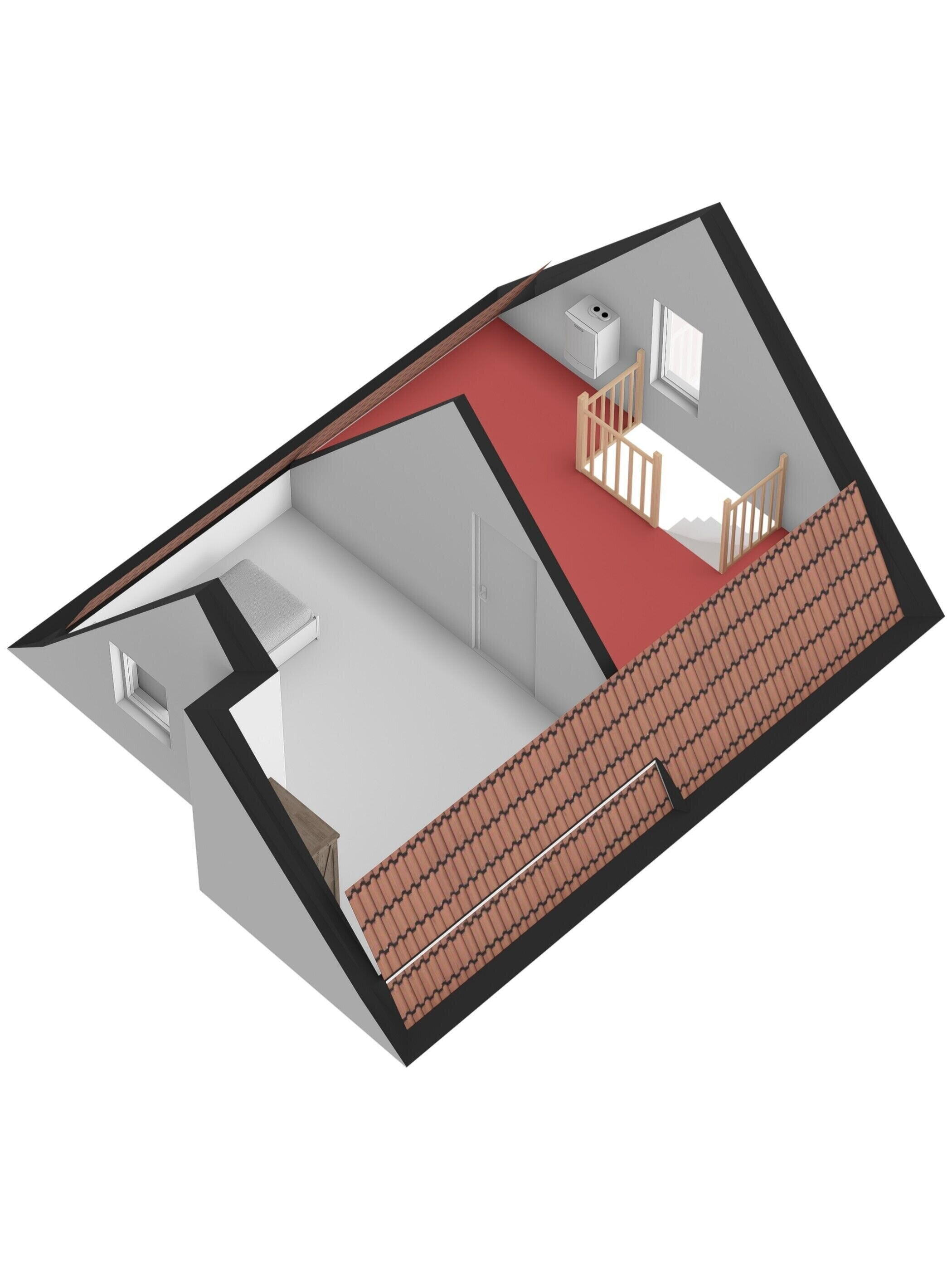 De vierde (slaap)kamer bevindt zich eveneens op deze verdieping. Deze fijne ruimte met hoog puntdak voelt heerlijk ruimtelijk aan en beschikt over een draairaam voor natuurlijke ventilatie en extra lichtinval. Een perfecte kamer als extra slaapkamer, logeerkamer of rustige werkplek/hobbyruimte. Op de gehele zolder ligt een grijze vloerbedekking. Een complete en veelzijdige verdieping die de woning nog meer leefruimte geeft.