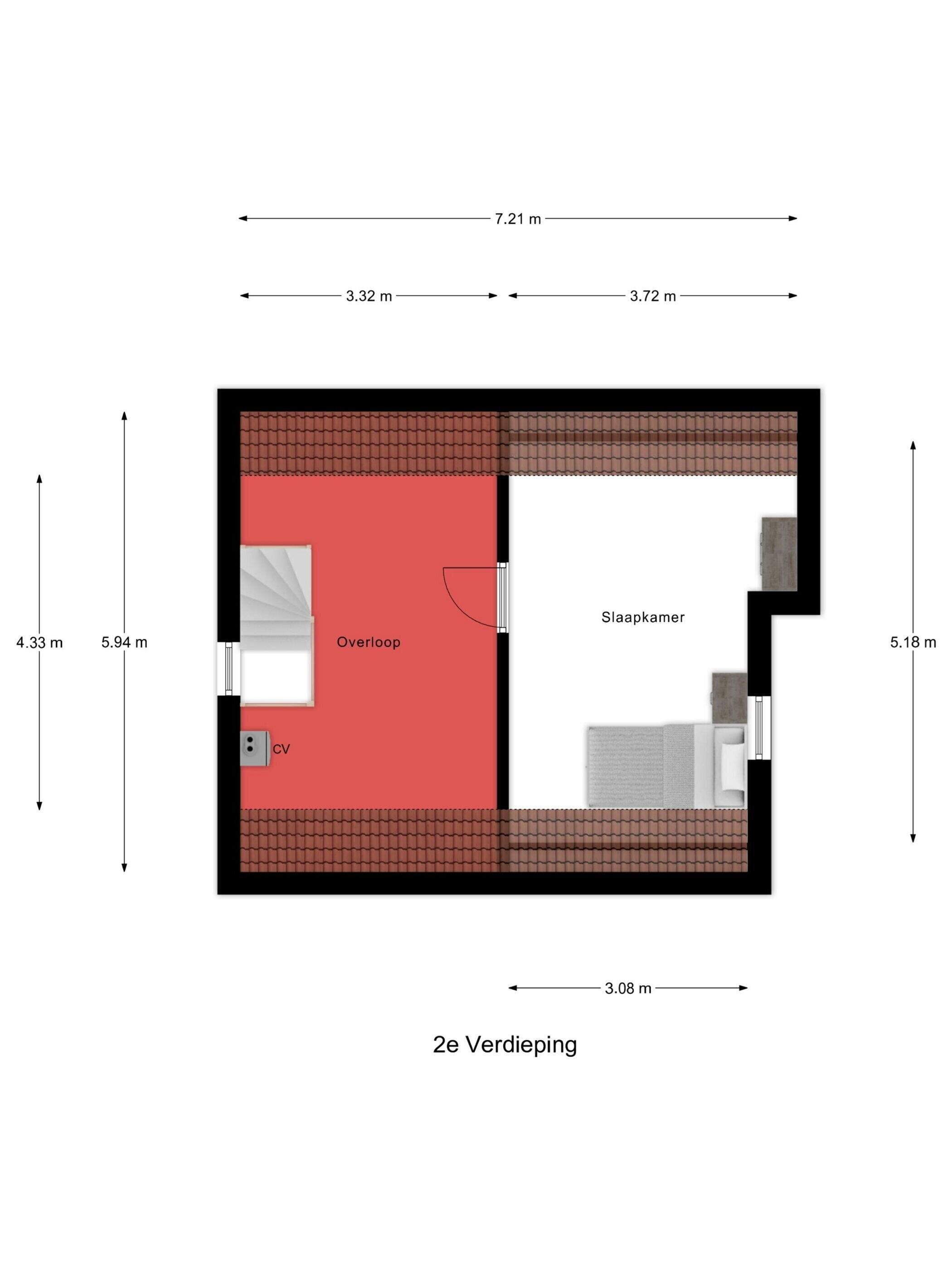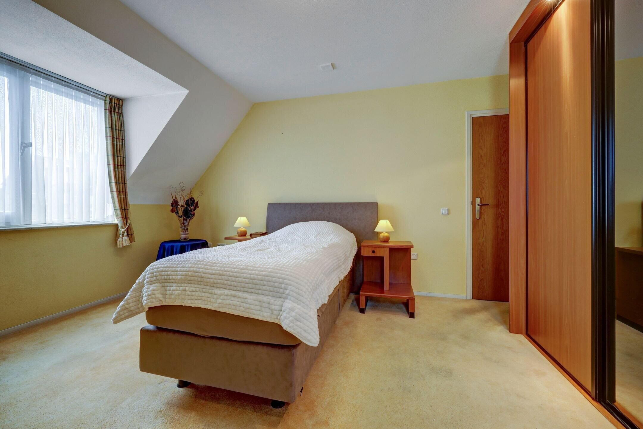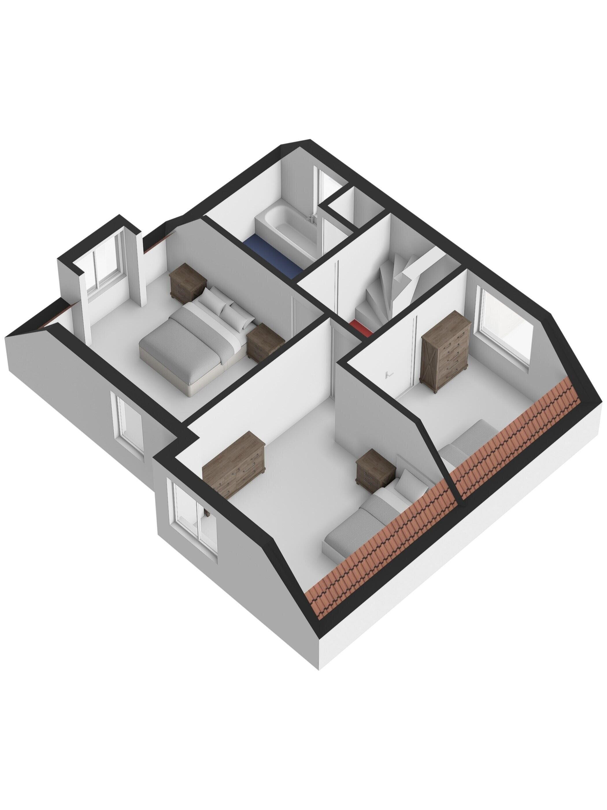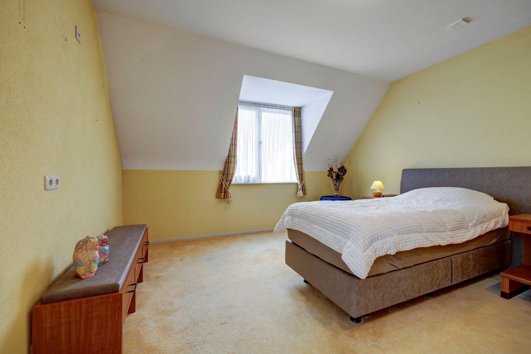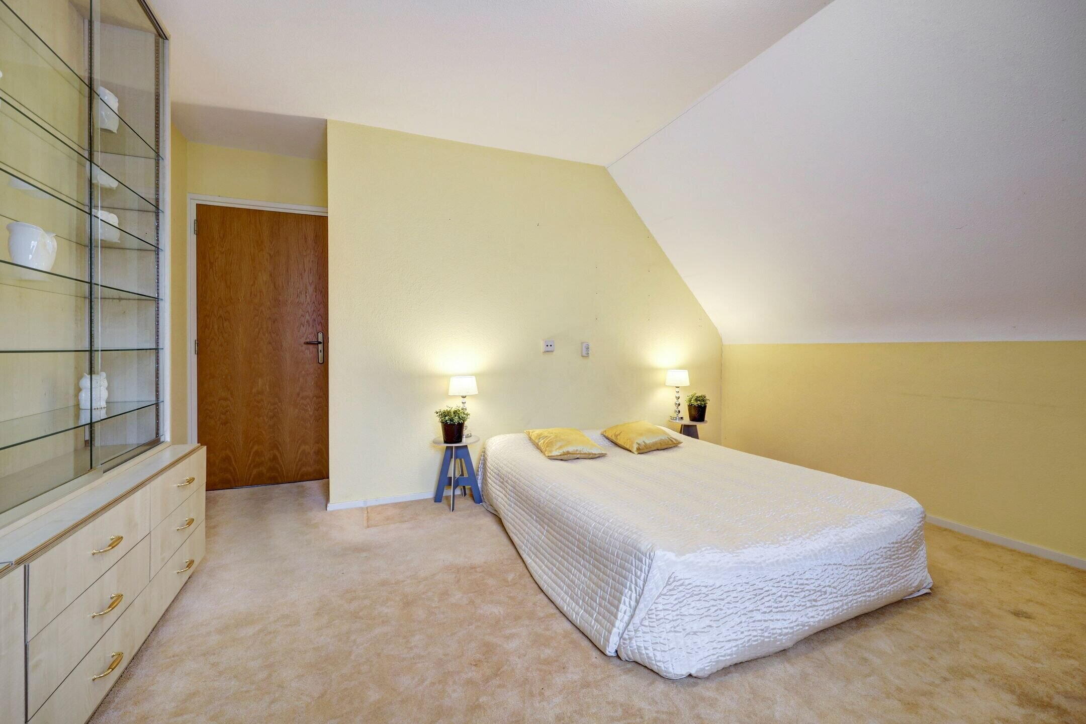 De vierde (slaap)kamer bevindt zich eveneens op deze verdieping. Deze fijne ruimte met hoog puntdak voelt heerlijk ruimtelijk aan en beschikt over een draairaam voor natuurlijke ventilatie en extra lichtinval. Een perfecte kamer als extra slaapkamer, logeerkamer of rustige werkplek/hobbyruimte. Op de gehele zolder ligt een grijze vloerbedekking. Een complete en veelzijdige verdieping die de woning nog meer leefruimte geeft.